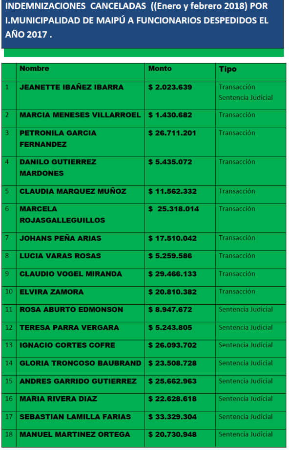 Ese podría ser el colofón  de lo que está ocurriendo en el municipio de Maipú dirigido por la Psicóloga ( Universidad Santo Tomás) Cathy Barriga, que sistemáticamente ha desarrollado una política de despidos de funcionarios municipales , desde el mismo día que asumió en diciembre de 2016.