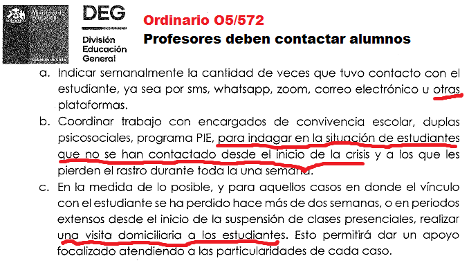 Cuando en los medios de comunicación, indica que es necesario el regreso a clases pues los estudiantes están perdiendo el año escolar, le quiero mencionar al Sr. Ministro que los estudiantes de este país no están perdiendo el año escolar, ya que con todo el esfuerzo del mundo hemos sostenido el sistema escolar desde nuestras casas hacia las casas de los y las estudiantes de Chile, claro, quizás el Ministro dice que no hacemos nada, puesto que el ministerio no ha invertido en la educación online ni en las capacitaciones a los docentes para que esta actividad educativa se realice, lo hemos hecho por nuestra cuenta, contratando un plan de internet o mejorando nuestro actual plan, además hemos adaptado un sitio de nuestra casa, en mi caso, mi comedor, para poder realizar las clases.